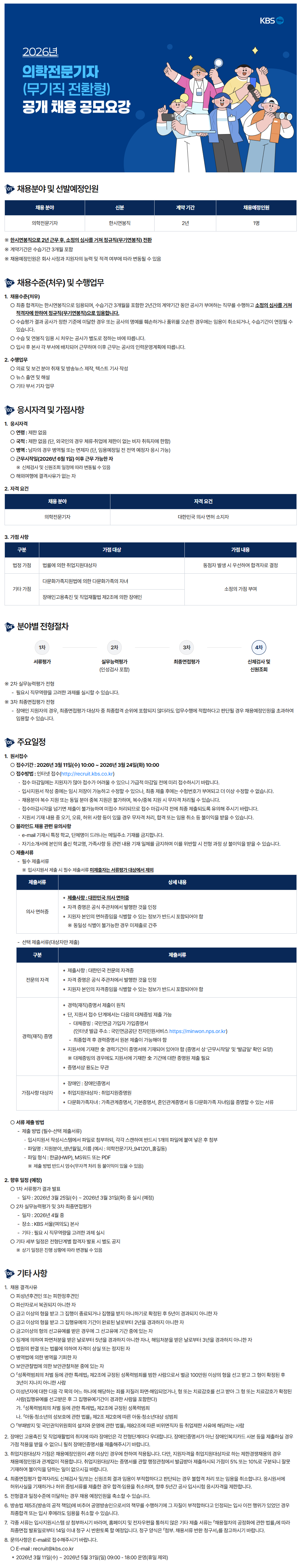 | 제목 | 2026년 KBS 의학전문기자(무기직 전환형) 공개채용 | ||